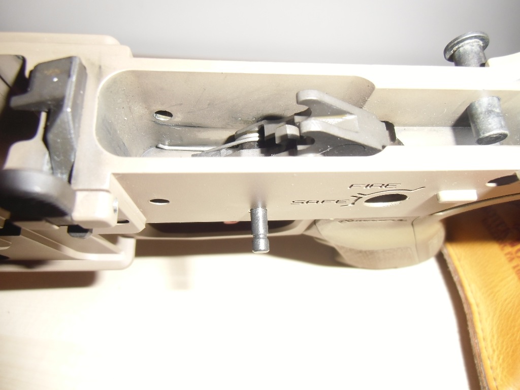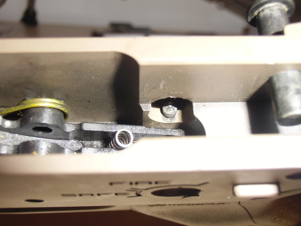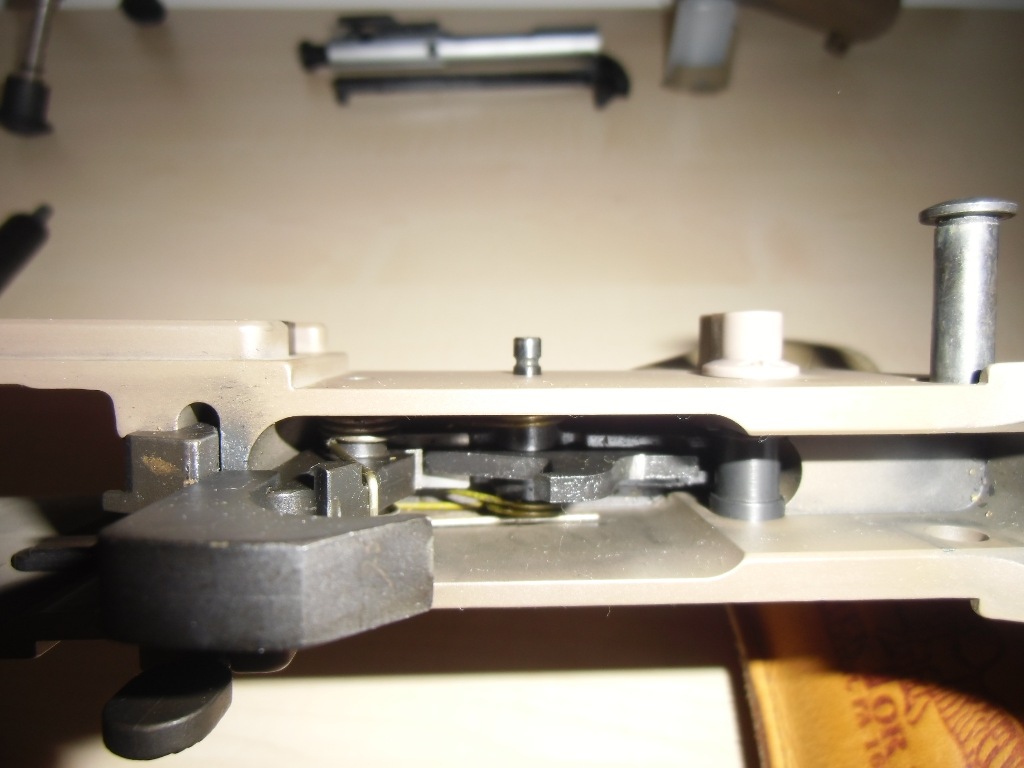 Nun werden die Teile rund um die Abzugssicherung wieder eingebaut. Zuerst der Bolzen und dann die beiden Sicherungshebel. Komischerweise ging der Rückeinbau des Bolzens ausgesprochen leicht: Bolzen bis zum Federbolzen im Lower-Gehäuse vorschieben und dann mit einem Durchschlag größeren Durchmessers den Federbolzen herunter drücken. Den Bolzen so gut es geht nachschieben und dann den Federbolzen mit einem dünneren Durchschlag weiter herunter drücken. Der Bolzen geht dann ziemlich leicht zurück in das Gehäuse und wird verriegelt.