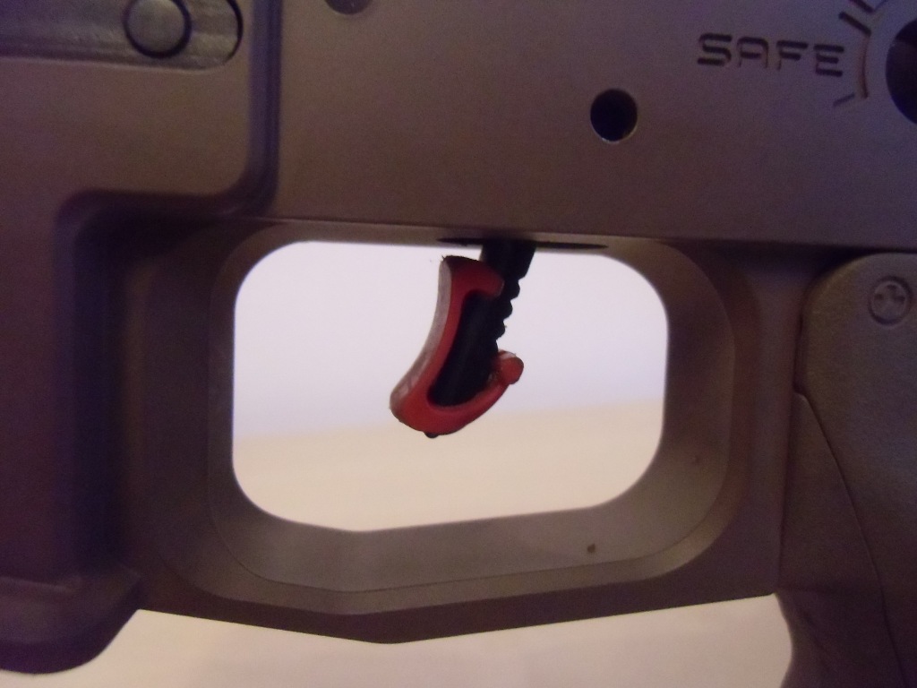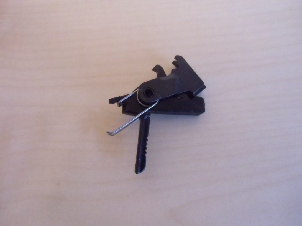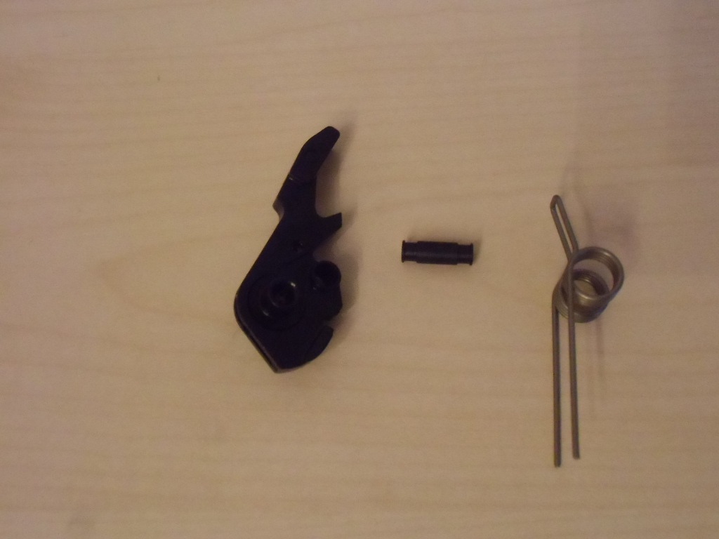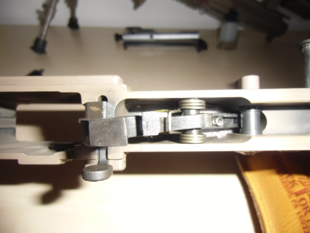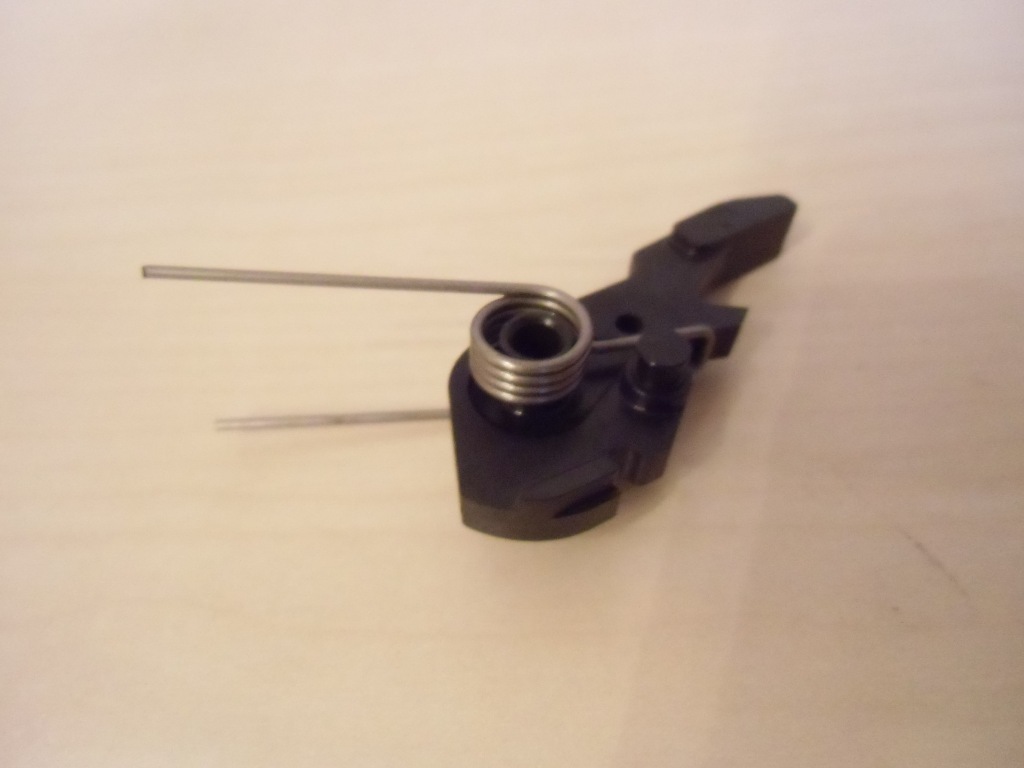 … wenn der nicht wie ein Billig-Spielzeug aus Fernost daher käme. Ich war echt enttäuscht, als ich den Kunststoffgrat auf dem Teil gesehen habe. Klar, dass fertigungstechnisch irgendwo ein Grat zu finden sein wird, aber direkt auf der Abzugsfläche? Für einen Tuningabzug ist das echt armselig! Also wurde der Feilensatz ausgepackt und vorsichtig nachgeschliffen. Nachpolieren mit Schleifvlies in zwei Körnungen und etwas WD40 ist ratsam. Sobald das Scheißteil glatt war, konnte es dann auch montiert werden.