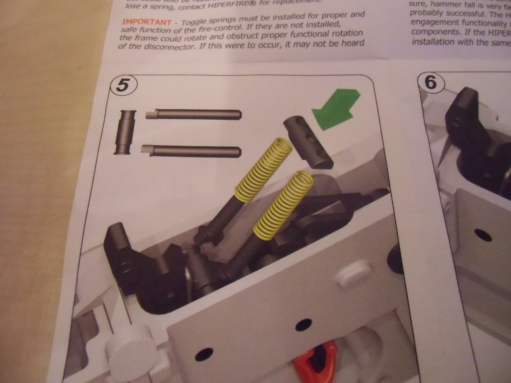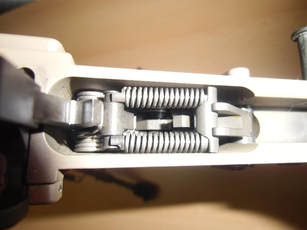 Auf jeden Fall werden die Federn auf die Führungsbolzen aufgefädelt und mit dem letzten verbleibenden Teil aus der Packung komprimiert, bis dieses dann unter dem gegenüber liegenden Rasthaken der Abzugsgruppe einrastet.