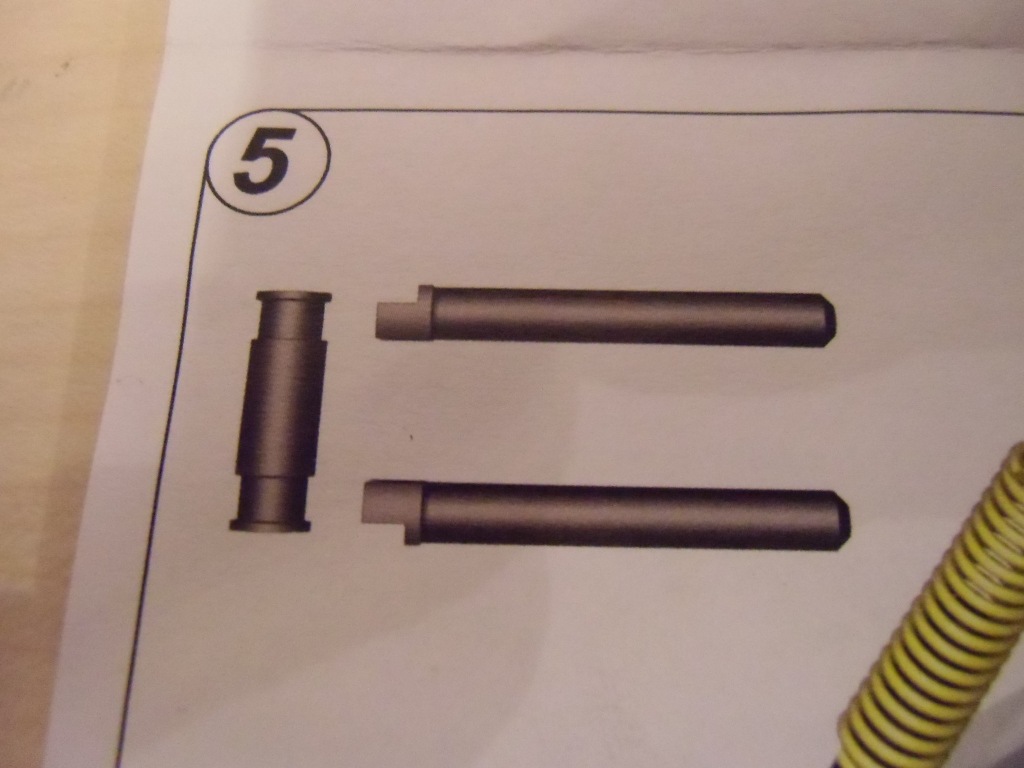 Weiter geht´s mit der Installation der Federn. Weil nicht alle Teile für den letzten Schritt für ein brauchbares Foto liegen bleiben, muss hier auch mal die Anleitung herhalten. Die Federführungsbolzen müssen nämlich richtig herum eingesetzt werden, das Detailbild zeigt das nochmal sehr deutlich.