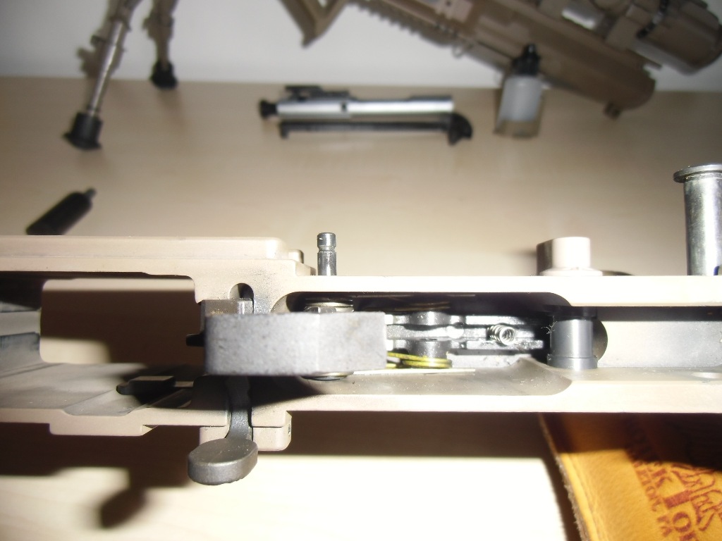 Die Feder muss in der gezeigten Lage montiert werden und der kurze Bolzen mit beidseitiger Ringnut wird durch die Bohrung rechts gesteckt. Achtung, der kurze Bolzen ist imstande wieder herauszufallen, bis die komplette Baugruppe im Lower sitzt.
