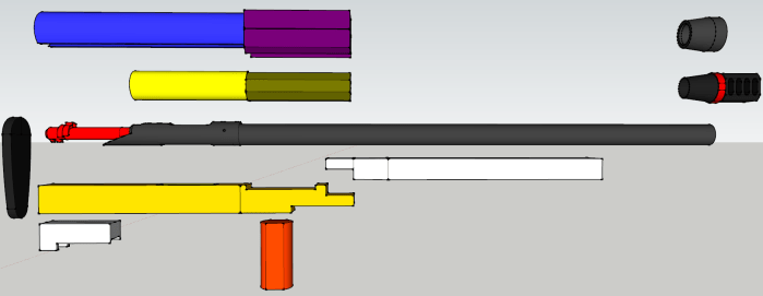 Diese Flinte habe ich in letzter Zeit wieder öfter mit auf die Range genommen und festgestellt, dass sie bisher kaum modifiziert wurde – das sollte sich ändern, denn mich hat mal wieder die Lust am Erfinden und Ausprobieren gepackt. Mit dem darauf montierten Reflexvisier EOTech 512 war ich schon länger nicht mehr zufrieden und so flog es kurzerhand runter, aber das nur am Rande. Die Erfahrung, die ich mit dem Design und Bau des Kompensator für den Schwedenmauser gesammelt habe, hat mich darin bestärkt, dass ich mich auch mal an einem MFD für eine Flinte versuchen könnte. Die nachfolgend zu sehende Variante ist dabei entstanden und sie fällt mit einer Gesamtlänge von 85mm standesgemäß groß – wenn nicht gar protzig – aus. Entlüftungskanäle nach oben hin sind reichlich vorhanden und es ist mir sogar gelungen, mit dem Farbton „hellbronze“ eine Farbvariante zu erhalten, die einigermaßen zu den restlichen Farbtönen der Flinte passt. Eine schwarze Variante durfte dabei natürlich nicht fehlen.