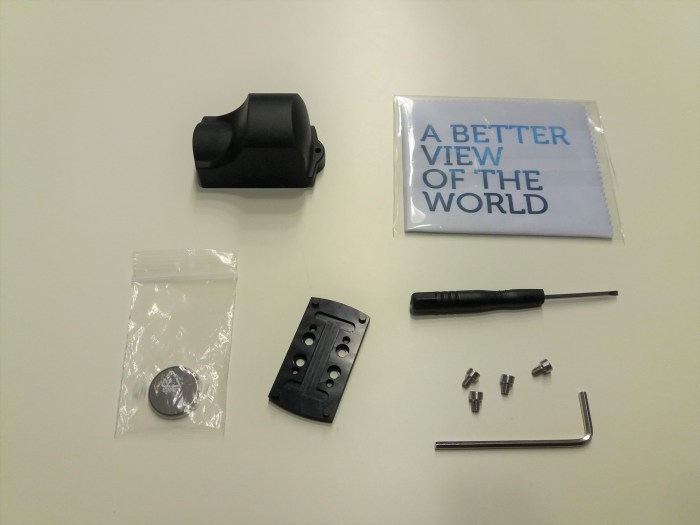 Das folgende Bild zeigt fast das gesamte Zubehör des Meosight 3. Außerdem enthalten sind noch zwei längere Schrauben M3, die ich dazu verwendet habe, das Visier direkt auf die Picatinny-Montage zu schrauben.