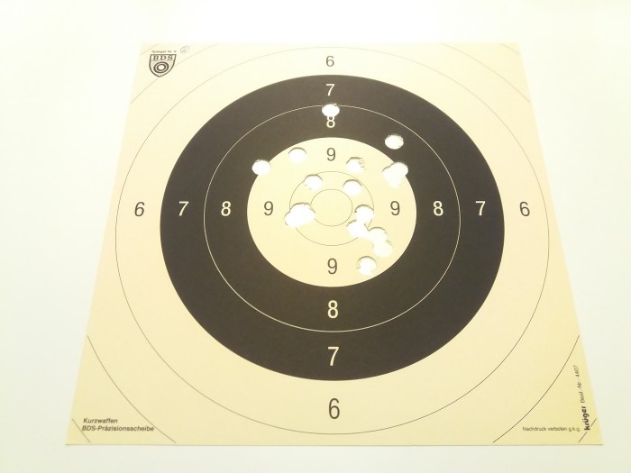 Diese Schussbilder sind beim zweiten Schießtermin entstanden, dank der nachgefeilten Schlüsselweite an der Picatinny-Montage hat sich auch nichts mehr gelockert. Eins vorweg: Sie sind alle mit dem zuletzt entwickelten Anschlagschaft entstanden! Während der ersten drei Schussbilder wurde 2x nachjustiert, beim vierten Schussbild war ich dann zufrieden und beim fünften habe ich den Anschlagschaft demontiert – man sieht deutlich, wie die Waffe wieder hochschlägt.