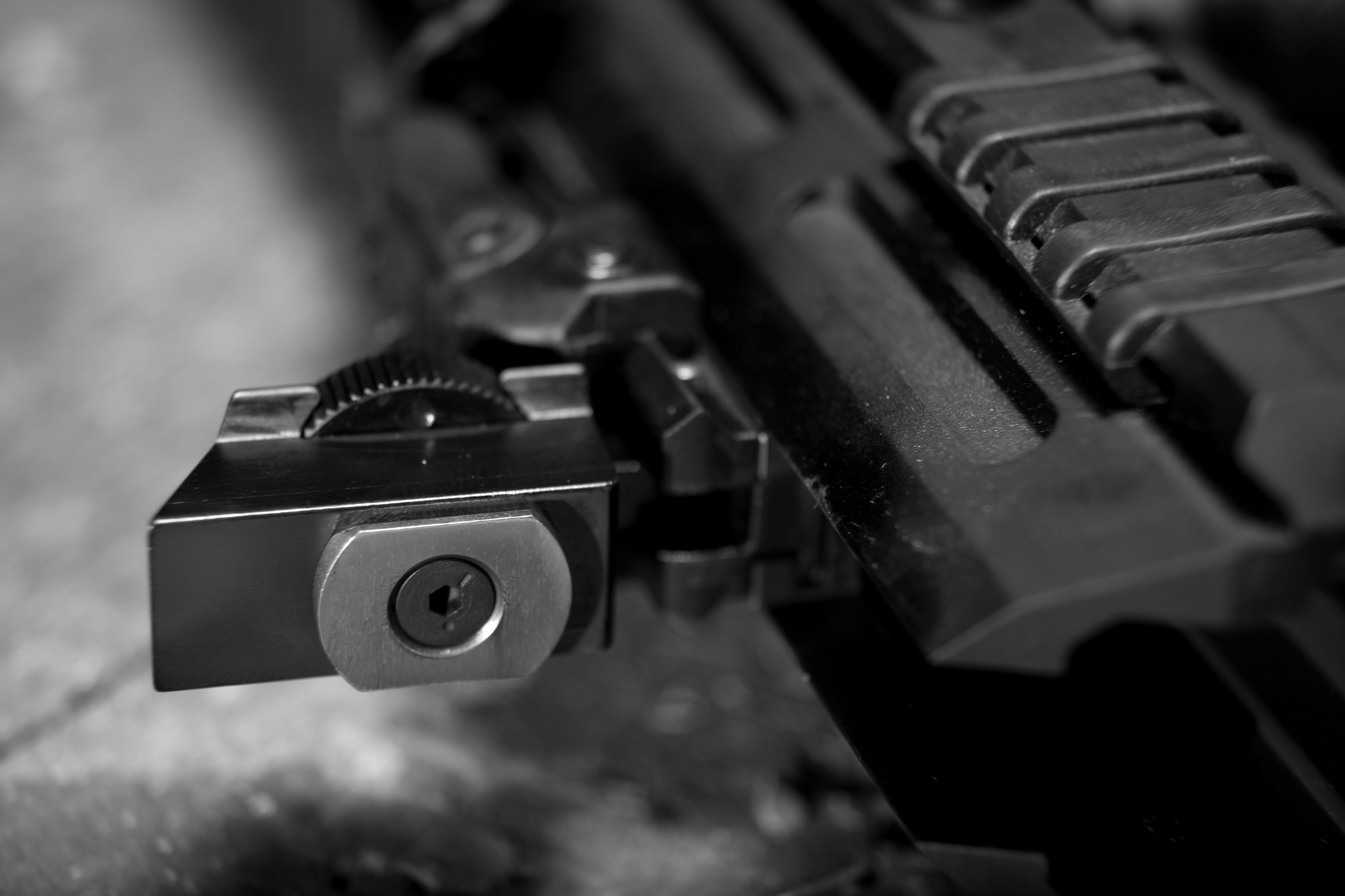 Um die Waffe in den Triarii zu bekommen, ist lediglich eine Verriegelung zu lösen. Dazu wird das sauber rastende Rad, welches sich am vorderen Ende der zwölf Uhr Schiene befindet um 90 Grad gedreht. Danach lässt sich die Verriegelung hochklappen und der Vorderschaft kann um ca. 7 cm nach vorne gezogen werde. Die Waffe wird mit dem Beavertail eingelegt und in Position geschwenkt. Der Vorderschaft wird zurück gezogen, wobei sie die Aussparungen im Vorderschaft passgenau um die Schiene der Pistole gleitet. Die Verriegelung wird nach unten geklappt und das Verriegelungsrad wieder zurück gedreht. Wenn man es zwei Mal gemacht hat, dauert der gesamte Vorgang wenige Sekunden. Anschließend kann das Magazin eingesetzt werden und die Waffe wird mit dem Durchladehebel auf der linken Seite schussbereit gemacht.