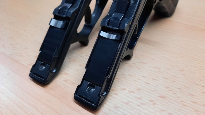 Achtung: Das Magazin muss stirnseitig noch im oberen Bereich eine Auskehlung erhalten, damit die vormals gerade Kante nicht von unten an den Verschluss stößt, bevor das Magazin die Chance hat, einzurasten. In diesem Bereich läuft das angeschweißte Metallplättchen auch sehr dünn aus, das obige Bild zeigt das sehr gut.