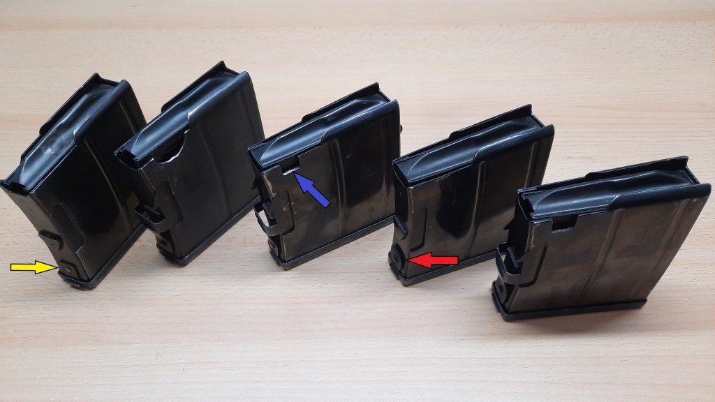 Ganz links ist das Magazin eines AG42 Ljungman zu sehen. Mit dem Nachsatz „B“ hat das Modell dann einige Verbesserungen erfahren, so z.B. die federnden Rasthaken am Magazin, um dessen Zuverlässigkeit zu erhöhen. Der gelbe Pfeil weist auf die noch nicht modifizierte Lasche für diese Rasthaken hin, ist auch mehr als deutlich zu erkennen. Ich habe das nur kenntlich gemacht, weil das zweite Magazin von rechts sehr ähnlich aussieht, aber leider nur, weil es einen Defekt aufweist. Später wurde mit dem gleichen Niet jedenfalls auch das erwähnte Blechbiegeteil mit den Rasthaken dort befestigt. An einem Magazin ist mir dieses, wie bereits erwähnt, sogar abgebrochen (roter Pfeil). Die andere mir bekannte Verbesserung am Modell „B“ ist die Verwendung einer Gasrückführung aus Edelstahl – die zuvor für den AG42 gewählte war aus normalem Stahl und begann mit der Zeit zu rosten. Das kann man aber so ebenfalls auch bei Wikipedia nachlesen… Die Bisweilen mehr oder weniger schönen Aussparungen an der linken Magazinseite (blauer Pfeil) dienen dazu, das Magazin auch noch an eine bestimmte Waffe zu binden, indem man dort im Magazinschacht im oberen Bereich einen Schweißpunkt platzierte.