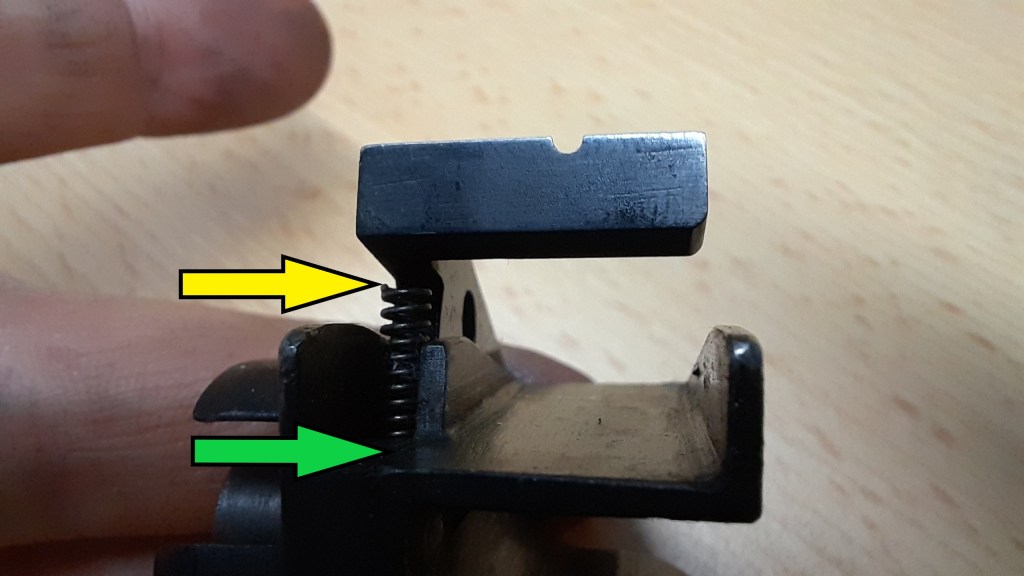 Jetzt beginnt der ätzende Teil der Arbeit, der bei mir zum Glück nur ein einziges Mal notwendig war: Im Inneren befand sich bei einem meiner Magazine ein Stück Flachstahl (ca. 3-4mm hoch), das an der Stelle des gelben Pfeils (links und rechts) an die Magazinwand gepunktet war. Zur Verdeutlichung habe ich mal ein Stück Pappe zur Nachstellung eingelegt. Ich habe wirklich lange überlegt, mit welchem elektrischen Werkzeug ich die Schweißpunkte ohne viel Begleitschaden wegbekomme, bin aber zu keiner Lösung gekommen. Ein Dremel könnte eine Lösung sein, wenn man eine kleine Trennscheibe an den Schweißpunkten ansetzen könnte, den hatte ich aber leider nicht. Vielleicht kann der eine oder andere Leser hierzu noch eines Tages etwas im Kommentarfeld berichten.