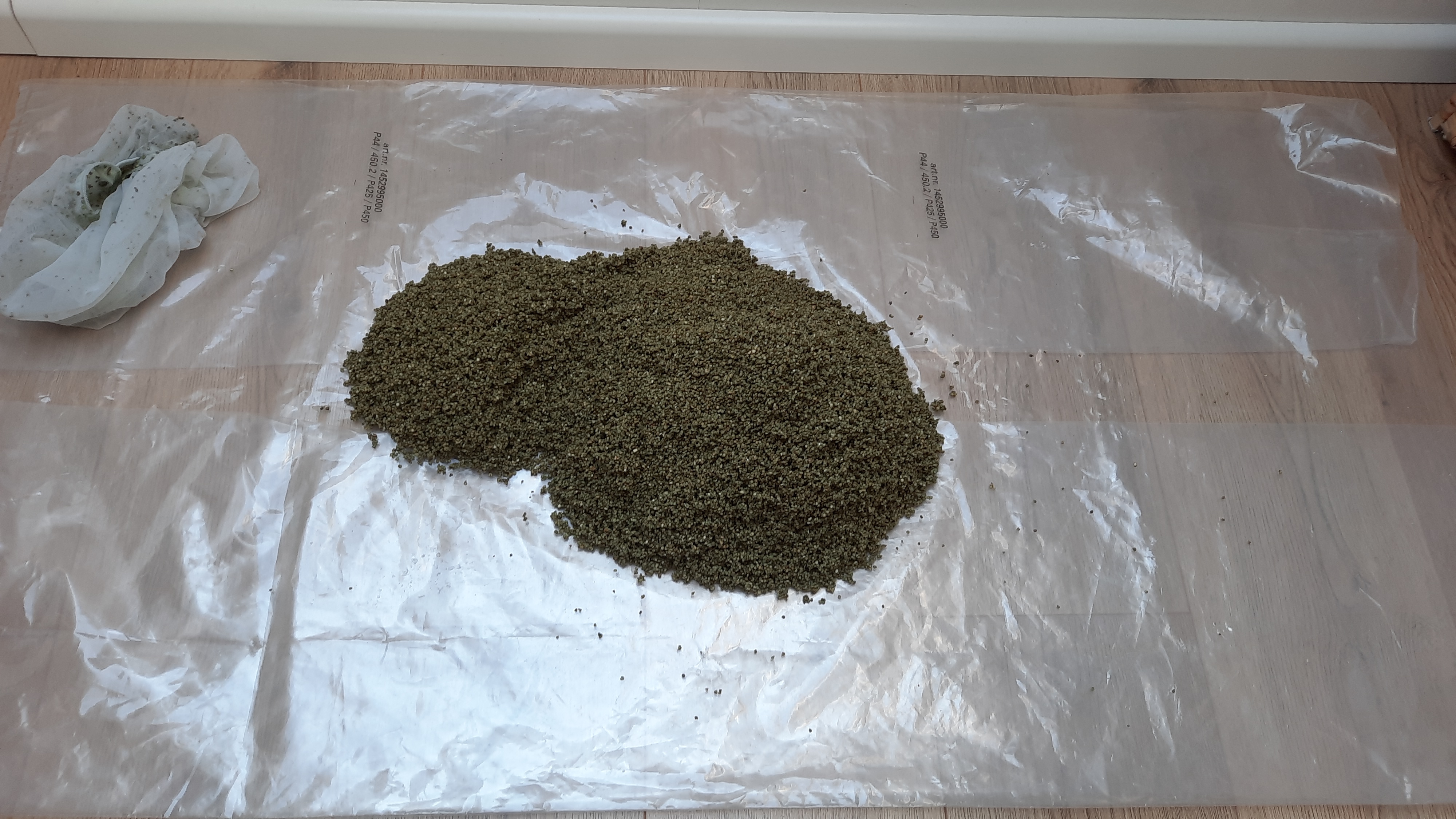 Zur Trocknung des Granulats habe ich einen großen Plastikbeutel mit ordentlich Materialstärke verwendet, den ich auf dem Boden vor dem Dachfenster ausgebreitet habe.