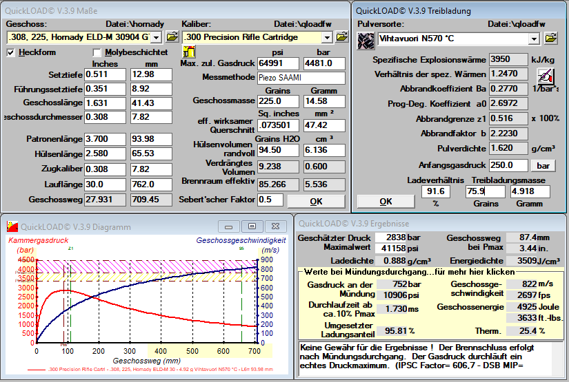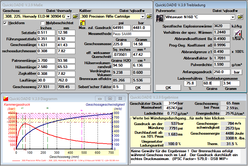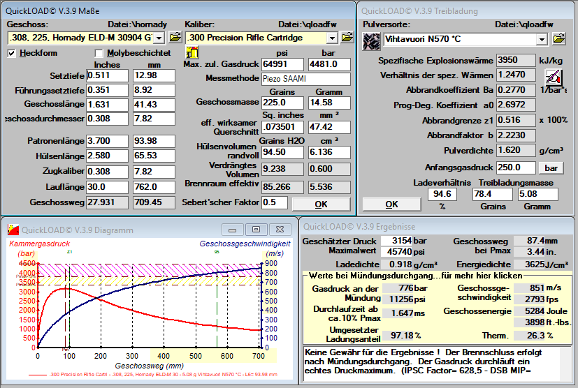 Das Diagramm wurde zwar berechnet, diese Laborierung habe ich letztendlich aber nicht mehr getestet, weil 63,3gr. Pulver einfach schon hervorragend laufen.