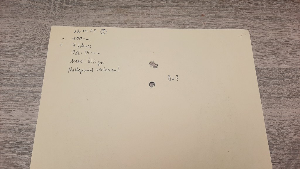Vier Schuss habe ich abgegeben und das Schussbild gibt Rätsel auf: Nur drei sichtbare Treffer inkl. einem Ausreißer. Ist hier wirklich ein Schuss perfekt „Loch in Loch“ gegangen? Haben die restlichen drei Schuss dann tatsächlich ein Lochbild von 9,5mm über Mitte? Hier ist für mich klar, dass ich diese Laborierung ein weiteres Mal testen werde.
