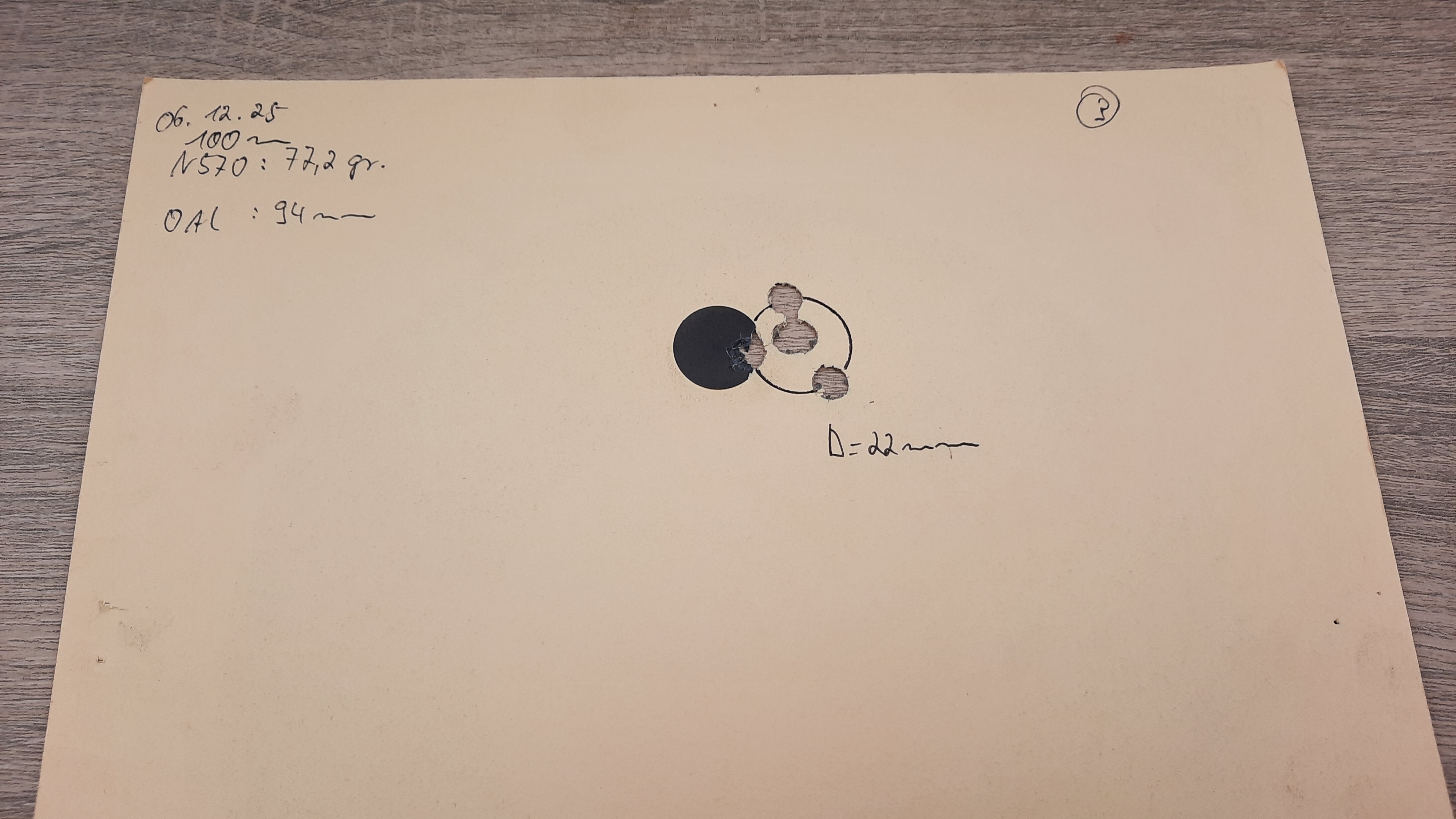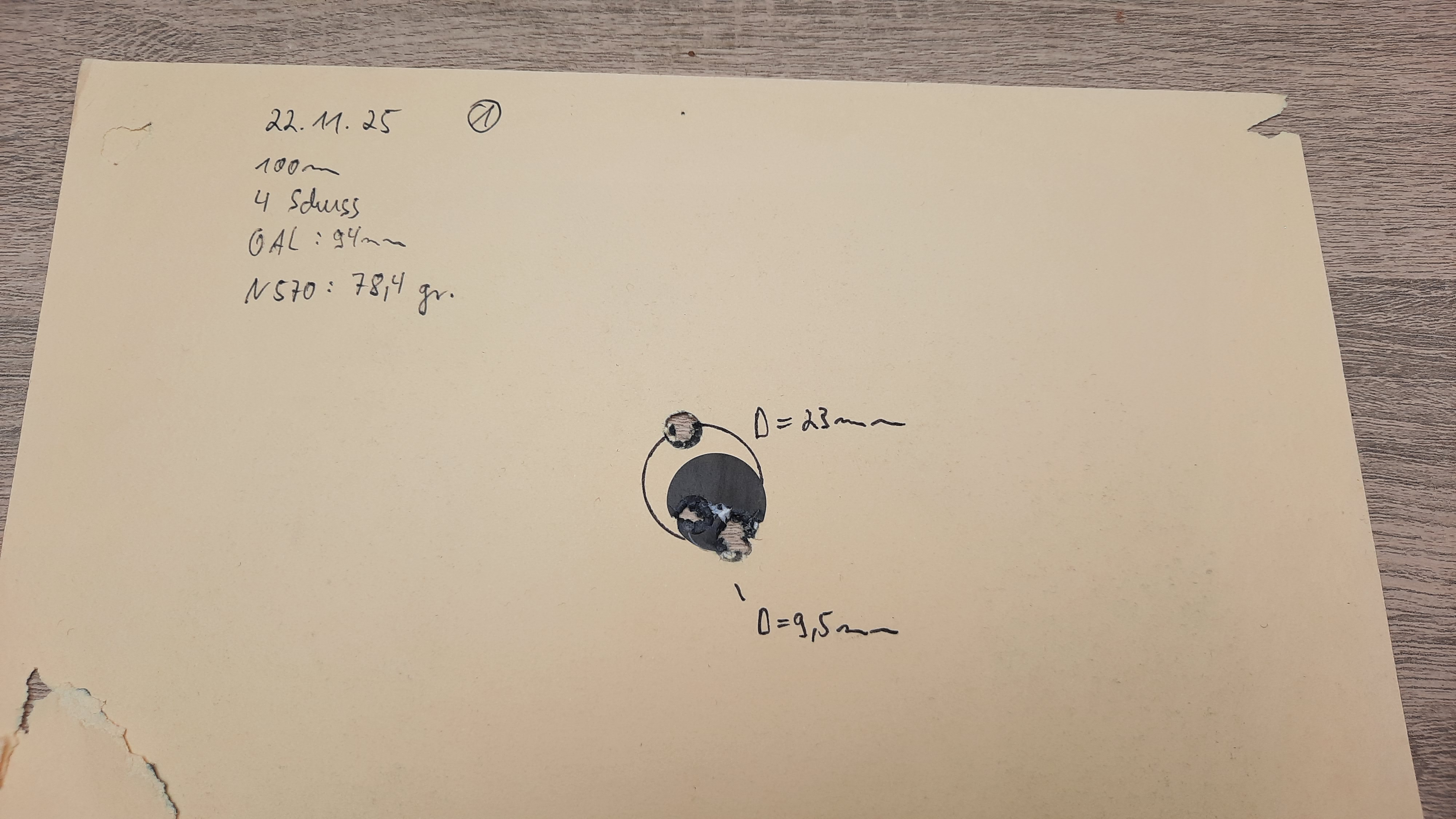 Das Ergebnis der zweiten Testserie mit dieser Laborierung und fünf Schuss hat mich positiv überrascht, der Streukreis ist genauso gut, wie die bisher beste Laborierung mit 75,9gr. N570: 11mm über Mitte gemessen.