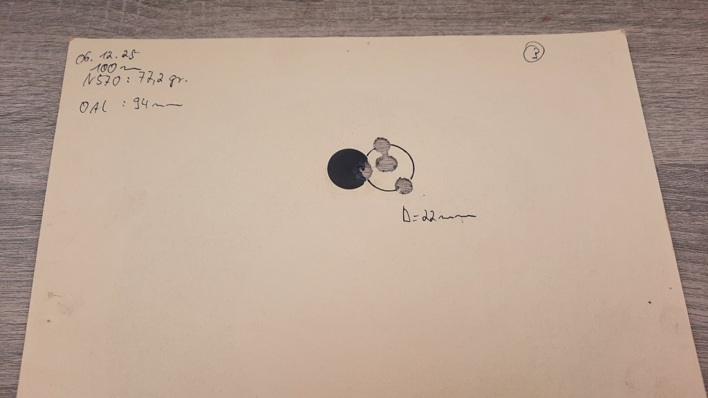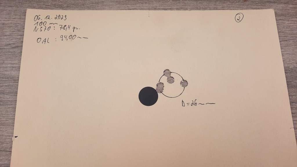 Das Ergebnis hat mir aber gezeigt, dass diese 1,3gr. mehr an Pulver schon einen Unterschied machen und den Streukreis verdoppeln – ich werde die bisher beste Laborierung mit 75,9gr. N570 also nicht härter laden. Im Gegenteil, ich werde mit wenigen Schüssen mal testen, ob 75,5gr. N570 nicht einen noch besseren Streukreis ergeben.