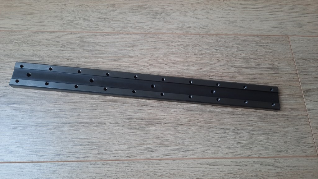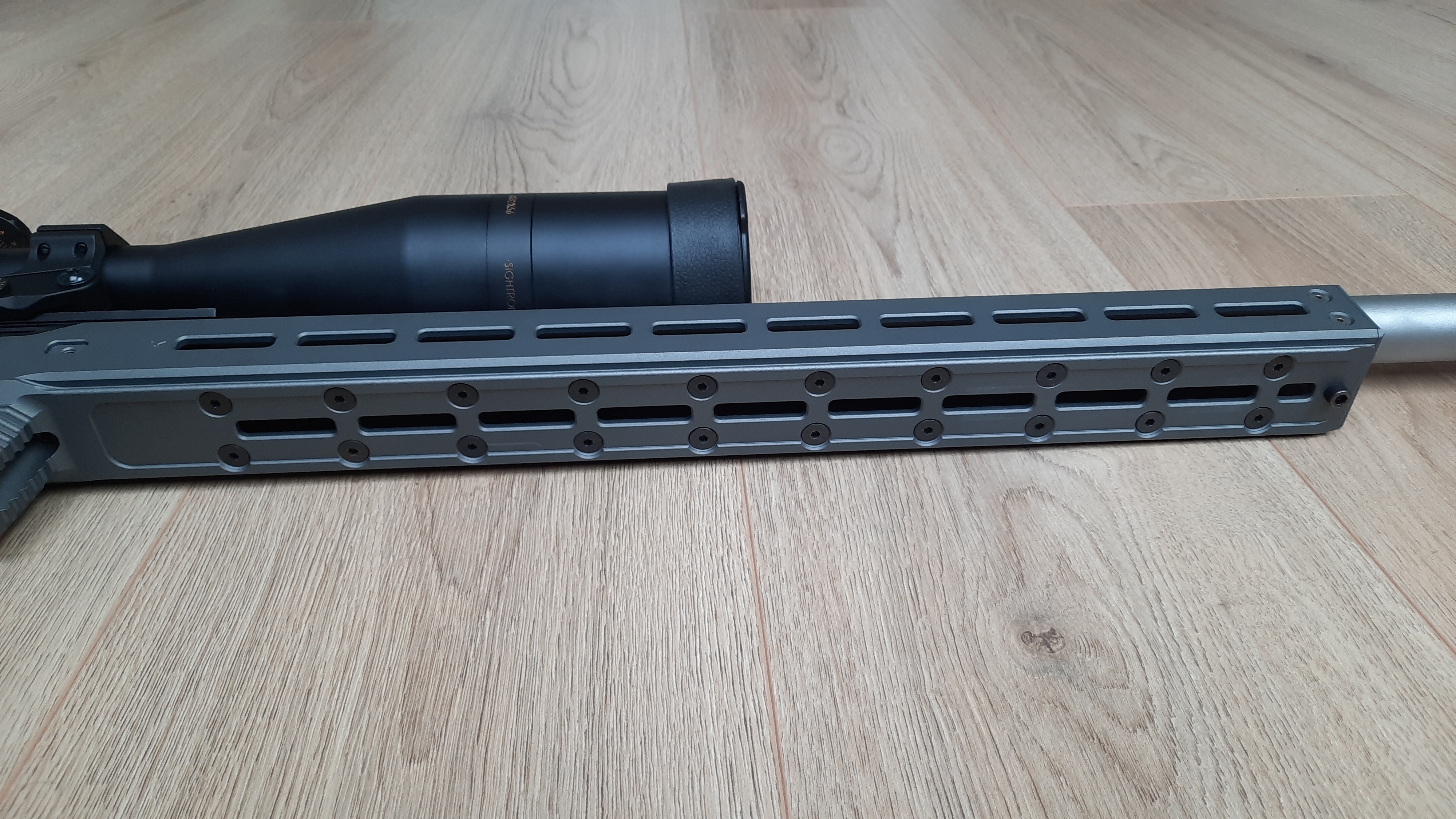 Von der Seite betrachtet sieht man das Gewicht durch den Schaft nicht, die Ventilation um den Lauf herum ist nach wie vor möglich. So sieht der Schaft nun von unten aus, die Picatinny-Schiene für das Zweibein ist auf dem Bild noch nicht montiert. Sie kann nun durch die Langlöcher in einem 87mm-Raster entsprechend Ihrem eigenen Lochabstand nach hinten versetzt werden.
