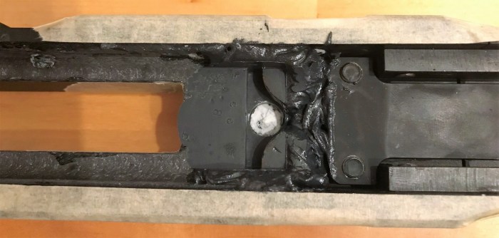 Das dafür mit mehr Epoxydharz als bisher. - Vordere und hintere Systemschraube werden in 2 Schritten mit 24h Abstand gebettet. Beginnend mit der vorderen Schraube, wird der Lauf mit barrel block und hinterer Systemschraube (eingesetzt und handwarm angezogen) ausgerichtet. Im zweiten Schritt wird dann der hintere Abschnitt gebettet, während barrel block eingesetzt ist und die vordere Systemschraube ordentlich angezogen ist.