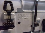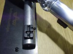 Auf dem Patronenlager Block, hinter dem Auswerfer und über der Laufmündung ist jeweils ein „Haken“ zu erkennen, in den die Visierschiene einhakt. Zusätzllich wird sie dann mit einem Querbolzen in den „Haken“ fixiert. Bei geschlossenem Verschluss wird der Querbolzen durch diesen verdeckt.