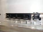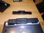 Das nachfolgende Bild zeigt Schlitten und Visierschiene vom Rest der Waffe demontiert. Im Schlitten sind Auswurffenster, Ausschnitt für die Visierschiene, Hammer und Verschlussmechanik zu sehen. Die vordere (rechts im Bild) Brücke / Verbindung zwischen den beiden Seiten des Schlittens stellt die Schnittstelle zwischen Schlitten und Verschlussmechanik dar. Die mittlere Brücke / Verbindung beinhaltet bolt face (deutsche Entsprechung?), den Schlagbolzen und spannt im Zurücklaufen den Hammer. Die hintere Brücke / Verbindung dient scheinbar nur der Stabilität des Schlittens.