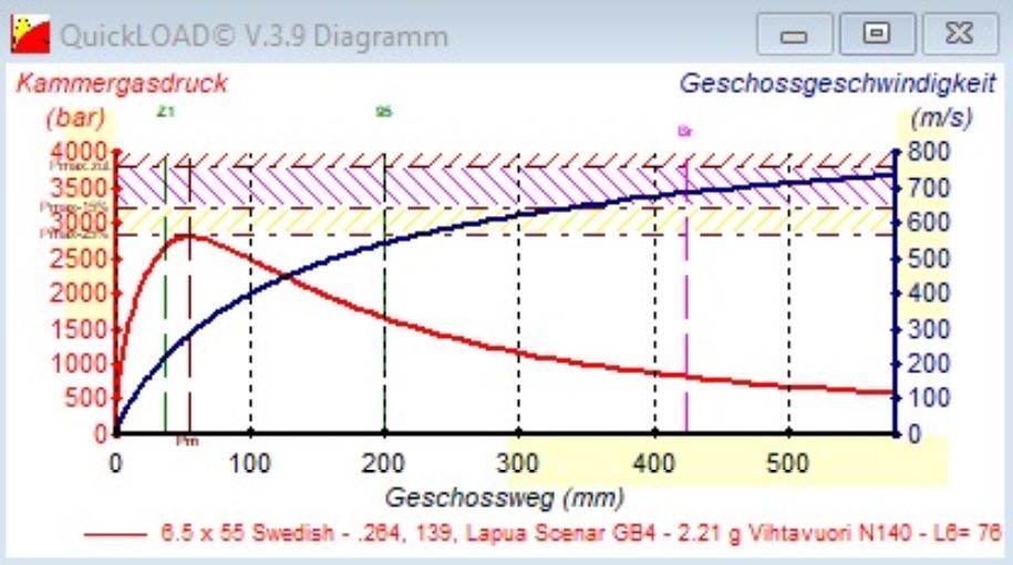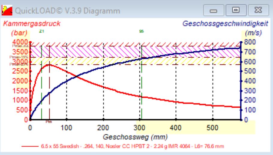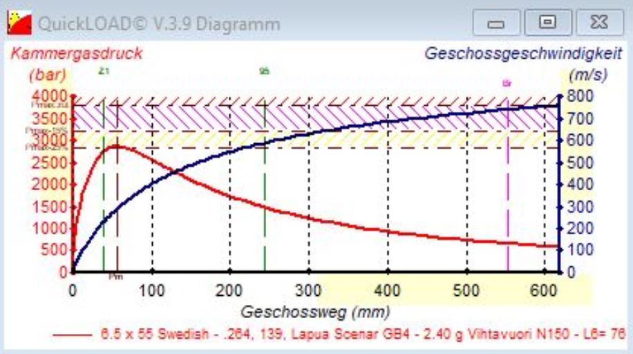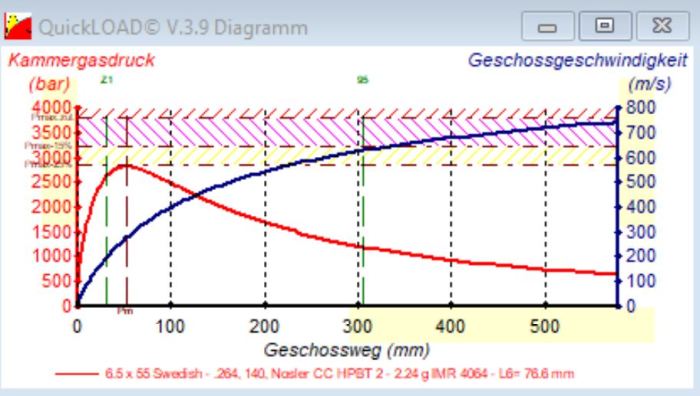 Im letzten Beitrag hatte ich ein Forum verlinkt, in dem für den AG42B bei Verwendung von progressiven (also langsam abbrennenden) Pulvern eine längere Schraube der Gasabnahme empfohlen wird, um den Impuls auf den Verschlussträger zu mindern, bevor dieser auf dem Sicherungsblock aufschlägt und Schäden verursacht. Das ist meiner Meinung nach nur die halbe Wahrheit, denn ich kann das laut meinen Untersuchungen nicht ausschließlich auf progressive Pulver zurückführen. Schauen wir uns dazu kurz das Gewehr selbst und drei Berechnungen von Laborierungen mit der Software Quickload an: Wenn ich die Lage der Patrone in der Kammer abschätze, so vermesse ich noch ca. 385mm Weg, den das Projektil im Lauf bis zum Passieren der Gaskanalbohrung zurücklegt. Runden wir das der Einfachheit halber mal auf 400mm auf und gehen in die nachfolgenden Diagramme, die mir Marvin zur Verfügung gestellt hat.