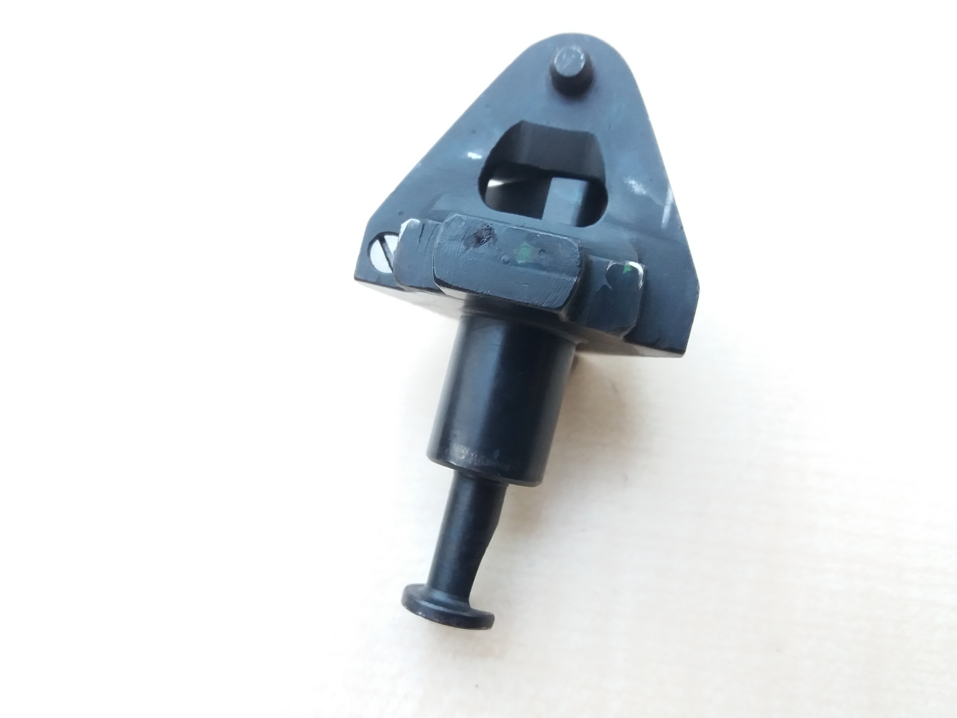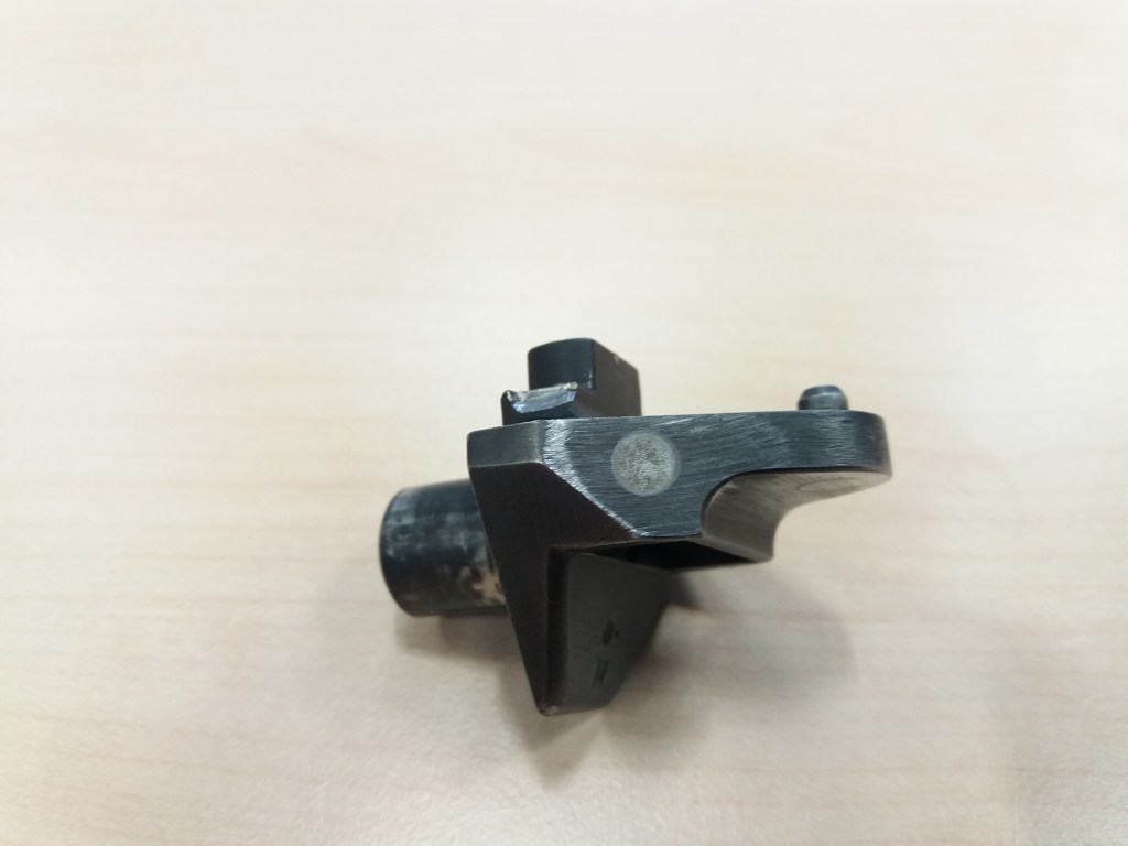 Das nachfolgende Bild zeigt meinen bereits reparierten Sicherungsträger. Die defekten Stellen wurden aufgeschweißt, nachgeschliffen und anschließend wieder brüniert. Der leichte Abrieb an den äußersten Ecken der Reparatur entstand während der Versuchsphase mit verschiedenen Schraubenlängen an der Gasabnahme. Ein Fortschritt des Abriebs wurde für die folgenden 40 Schuss nicht mehr beobachtet, sodass ich davon ausgehe, dass es in der jetzigen Konstellation Feder/Laborierung/Verschlussschraube zu gar keiner Berührung mehr zwischen Verschlussträger und Sicherungsträger kommt.