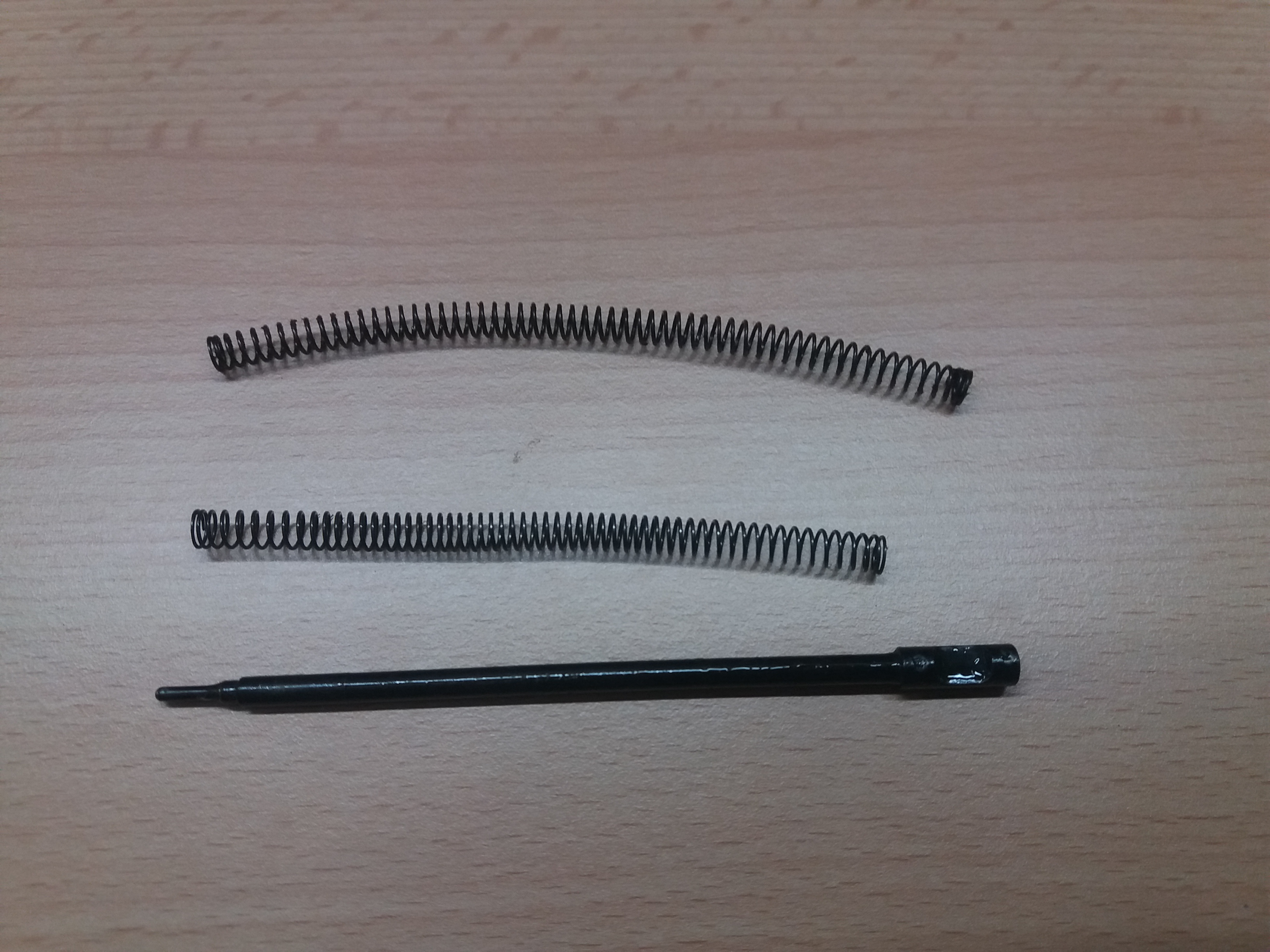 Die härteren Zündhütchen verbessern die Situation beim Verriegeln/erstmaligen Durchladen des Verschlusses wesentlich, aber es kann nach einem Schuss immer noch zu einer „Doppelung“ kommen – so bei mir geschehen. Deshalb: Wer neue Verschlussfedern einsetzt kommt nicht darum herum, auch die Feder des Schlagbolzens zu ersetzen!!! Das Ersetzen ist wirklich einfach: Verschlussabdeckung entnehmen und Verschluss aus dem Verschlussträger entnehmen. Im hinteren Bereich sieht man den Schlagbolzen, welcher durch einen gekerbten Stift gesichert ist. Der Stift wird ausgetrieben, indem man auf die nicht gekerbte Seite schlägt. Auf dem unteren Bild sieht man die neue und die (kürzere) abgenutze Feder, letztere ist über die Jahre des Gebrauchs ca. 20mm gestaucht worden.