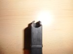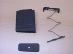 Von links nach rechts sind zu sehen die Bodenplatte mit Verriegelungsloch, das Magazingehäuse, der Ladelöffel mit entsprechend gewinkelter, mittiger Rampe für sauberes zuführen und das Verriegelungsstück / Federhalter ganz rechts.