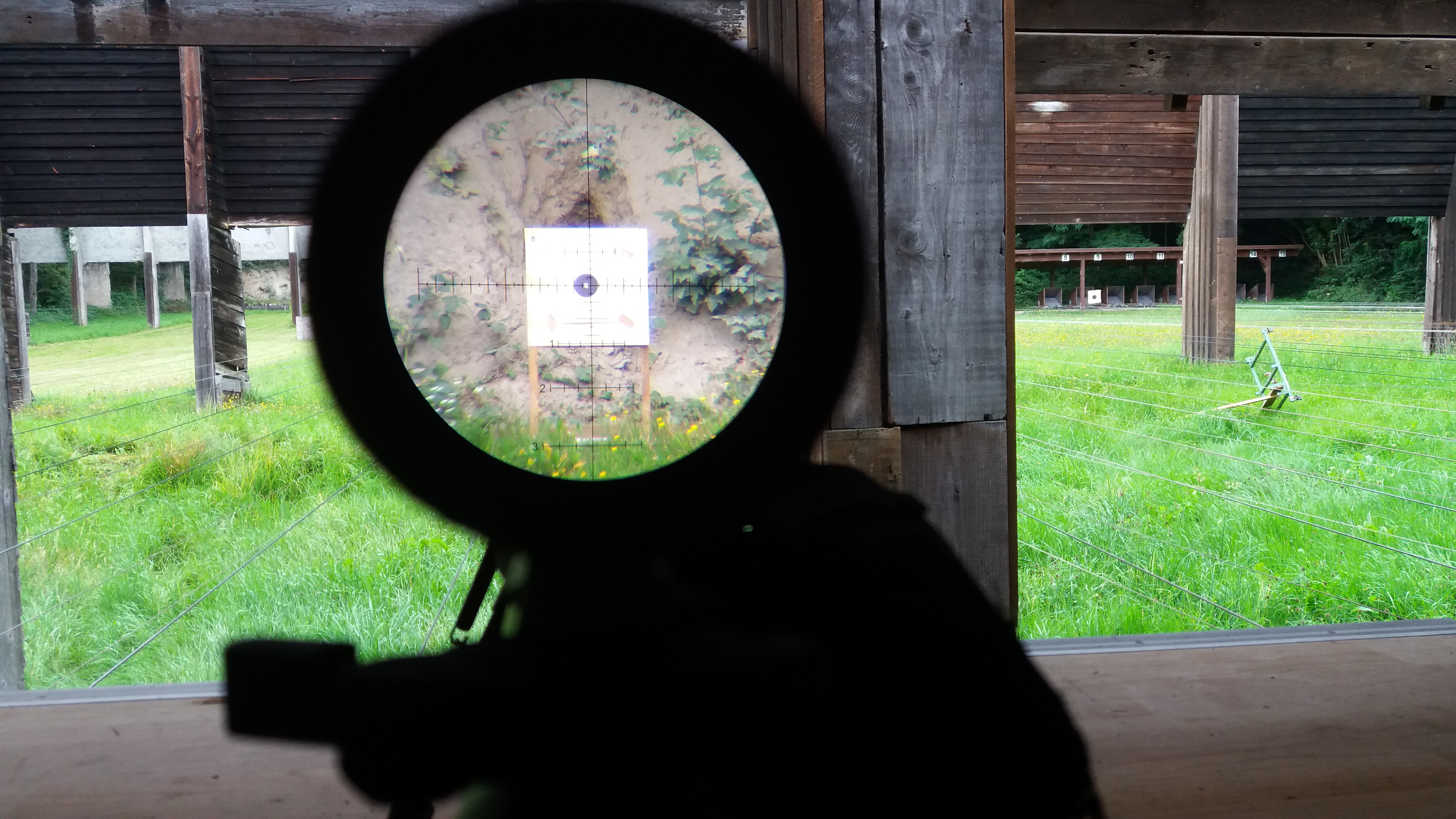 Der Parallaxeturm auf der 9-Uhr-Position ist hingegen leichtgängig und besitzt Einstellungen für die Distanzen 10, 15, 25, 30, 50, 100 und 300 Yards, sowie unendlich. Das Absehen ist fein gehalten, befindet sich in der zweiten Bildebene (wird also nicht mit vergrößert/verkleinert) und wirkt glücklicherweise nicht Überladen an Informationsflut. Auf 100m konnte ich die Einschüsse im Kaliber .223 Rem. bei 18-facher Vergrößerung noch wirklich sehr gut erkennen, allgemein hat das Glas ein sehr gutes Bild erzeugt. Man darf auch etwas erwarten, wenn der Hersteller/Importeur mit Schott-Gläsern aus Deutschland und einer Lichttransmission von 90% wirbt.