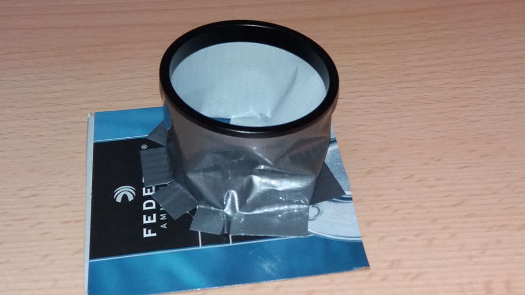 Vom Objektiv habe ich erst mal den Gewindering abgeschraubt und ihn am Gewinde mit Panzerband abgeklebt. Das breite Band habe ich dann fächerförmig eingeschnitten, damit ich es auf eine stabile Unterlage kleben kann.