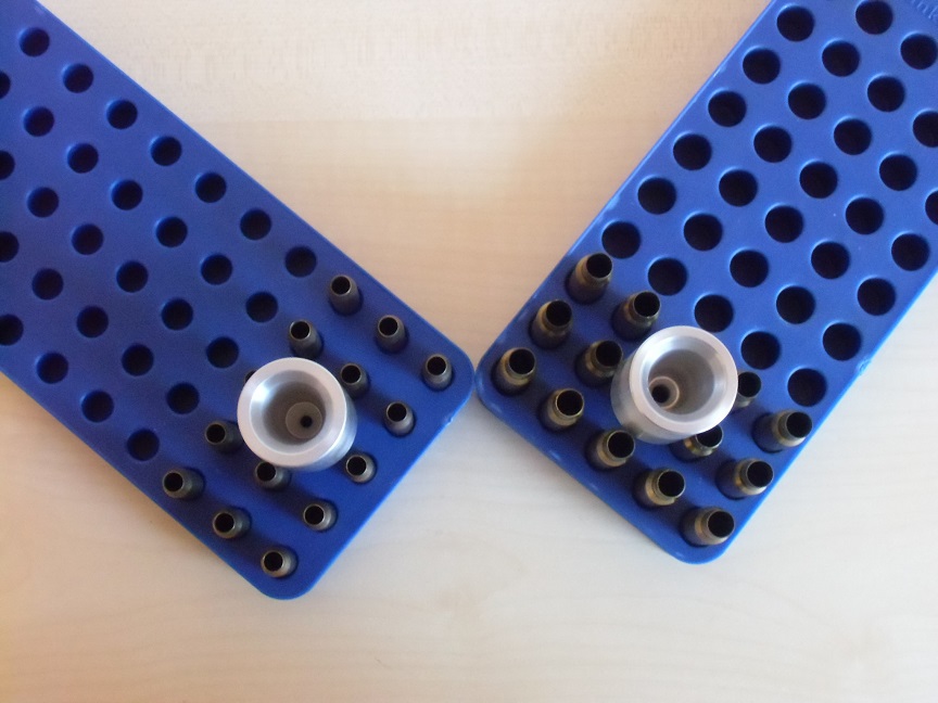 Wie Ihr seht, war ich zu knauserig, für jedes Kailber auch noch einen Powder-Check von Dillon zu kaufen. Das Umbauen und neue Justieren des Powder-Checks ist generell schnell gemacht, wenn man wenigstens noch eine Einschraubmatrize auf dieser Position hat. Da mich aber mal wieder der Erfindergeist gepackt hat, arbeite ich derzeit noch an einer optischen Variante des Powder-Checks, die werde ich bei Gelegenheit vorstellen. Und hier ist der Artikel auch schon!