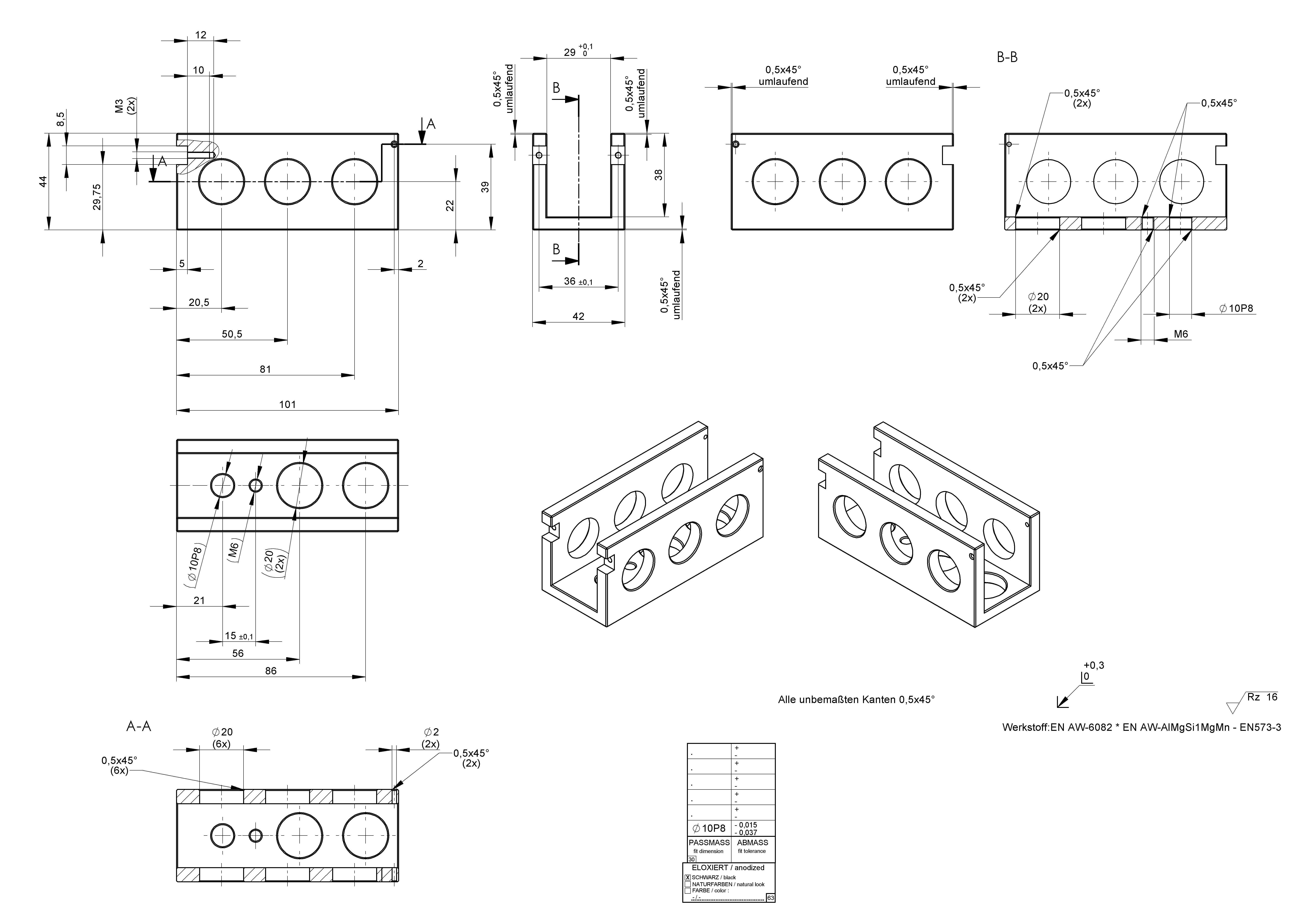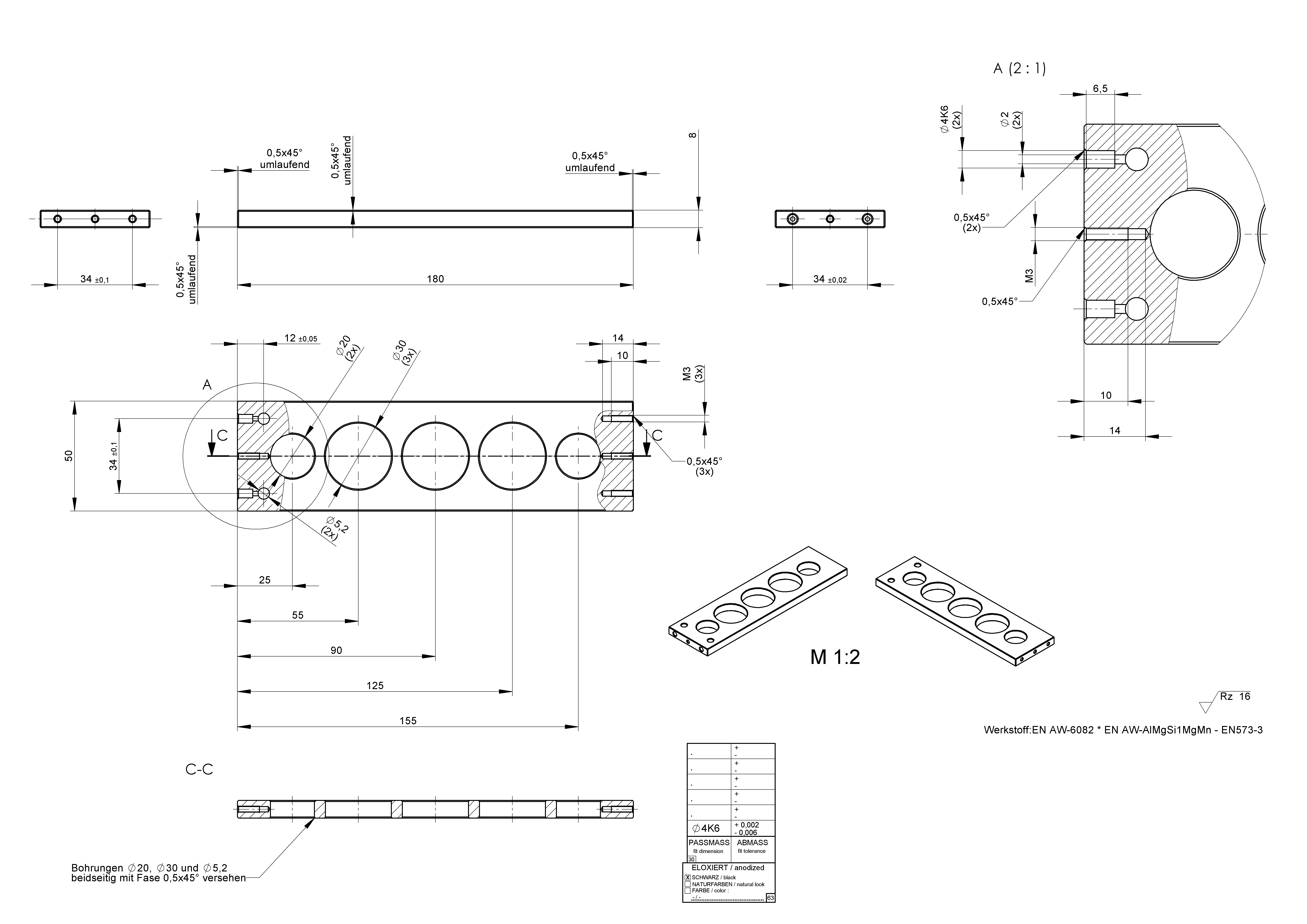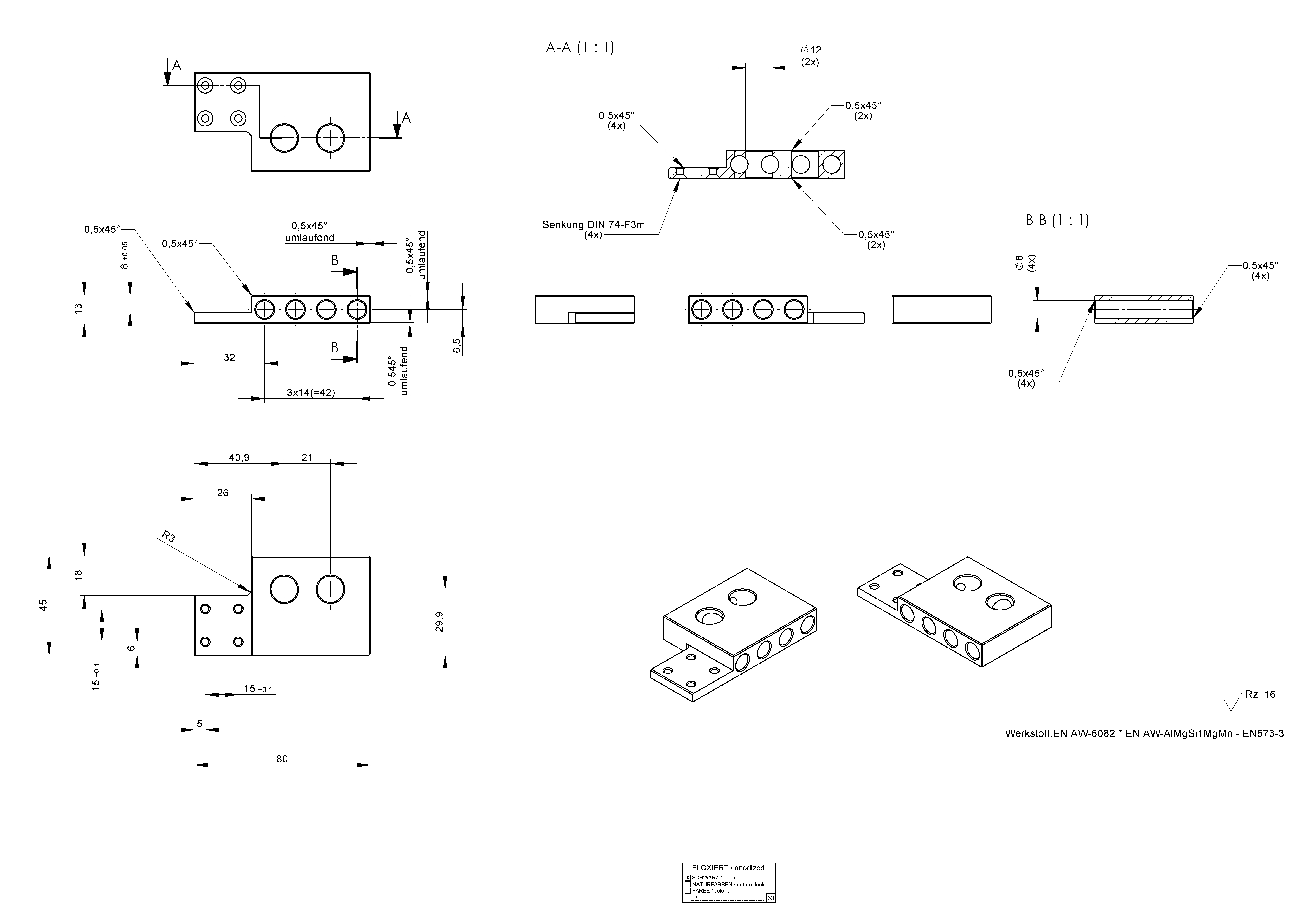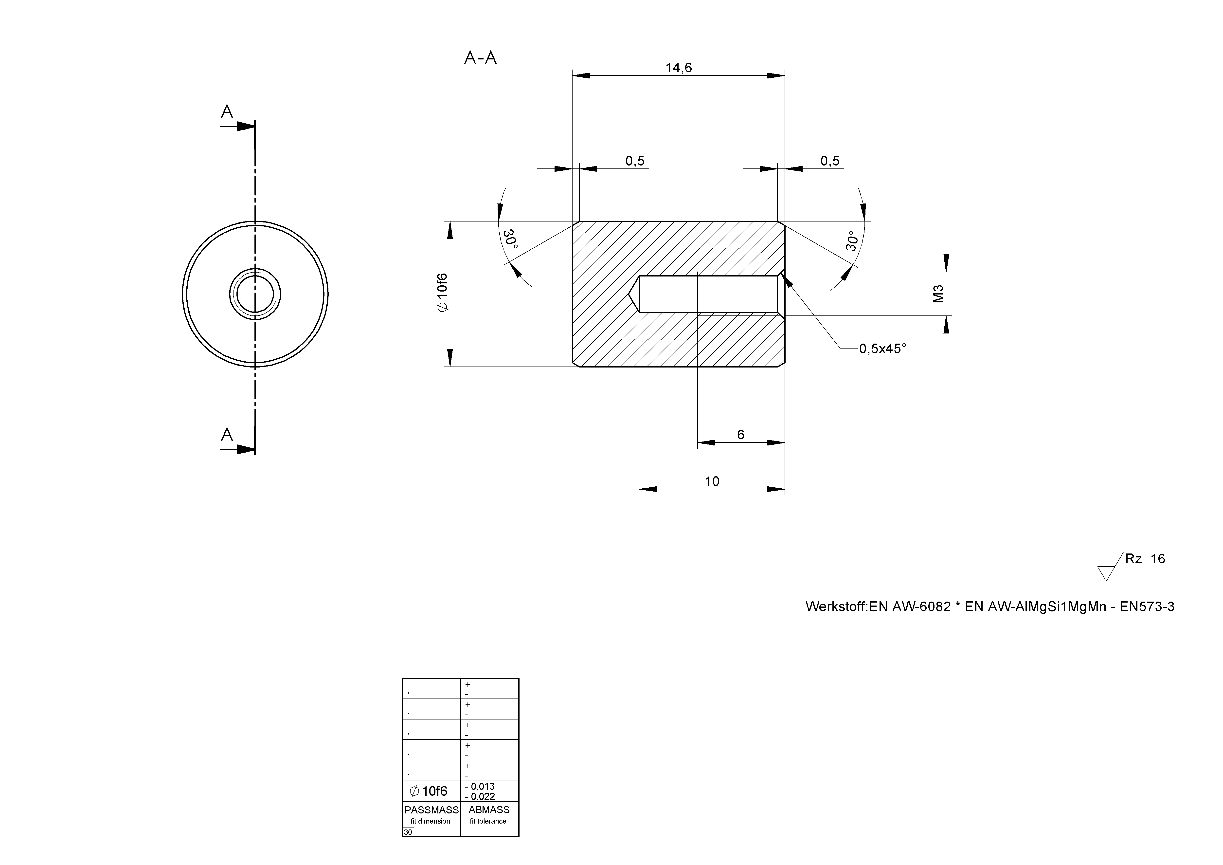 In die Strebe 2 wird jetzt die Bundbuchse gepresst, sodass der Bund in der Anspiegelung sitzt und leicht hervor steht. Die Strebe 2 kann dann mit den drei Senkschrauben M3x16-A2 an der Strebe 1 befestigt werden.