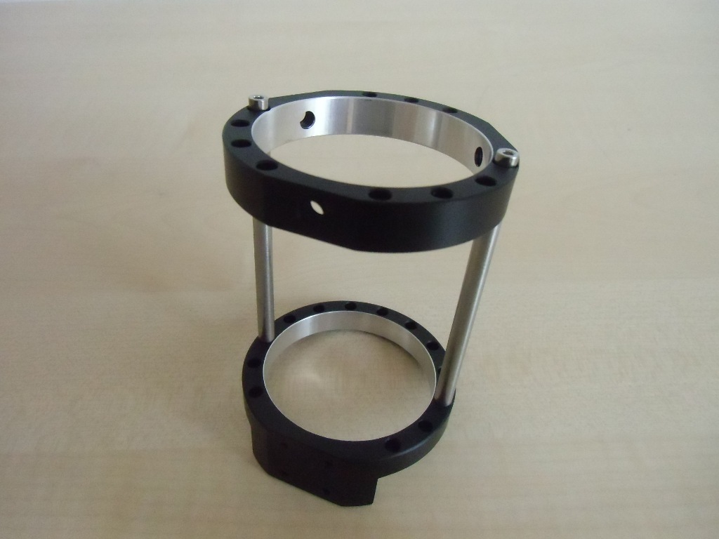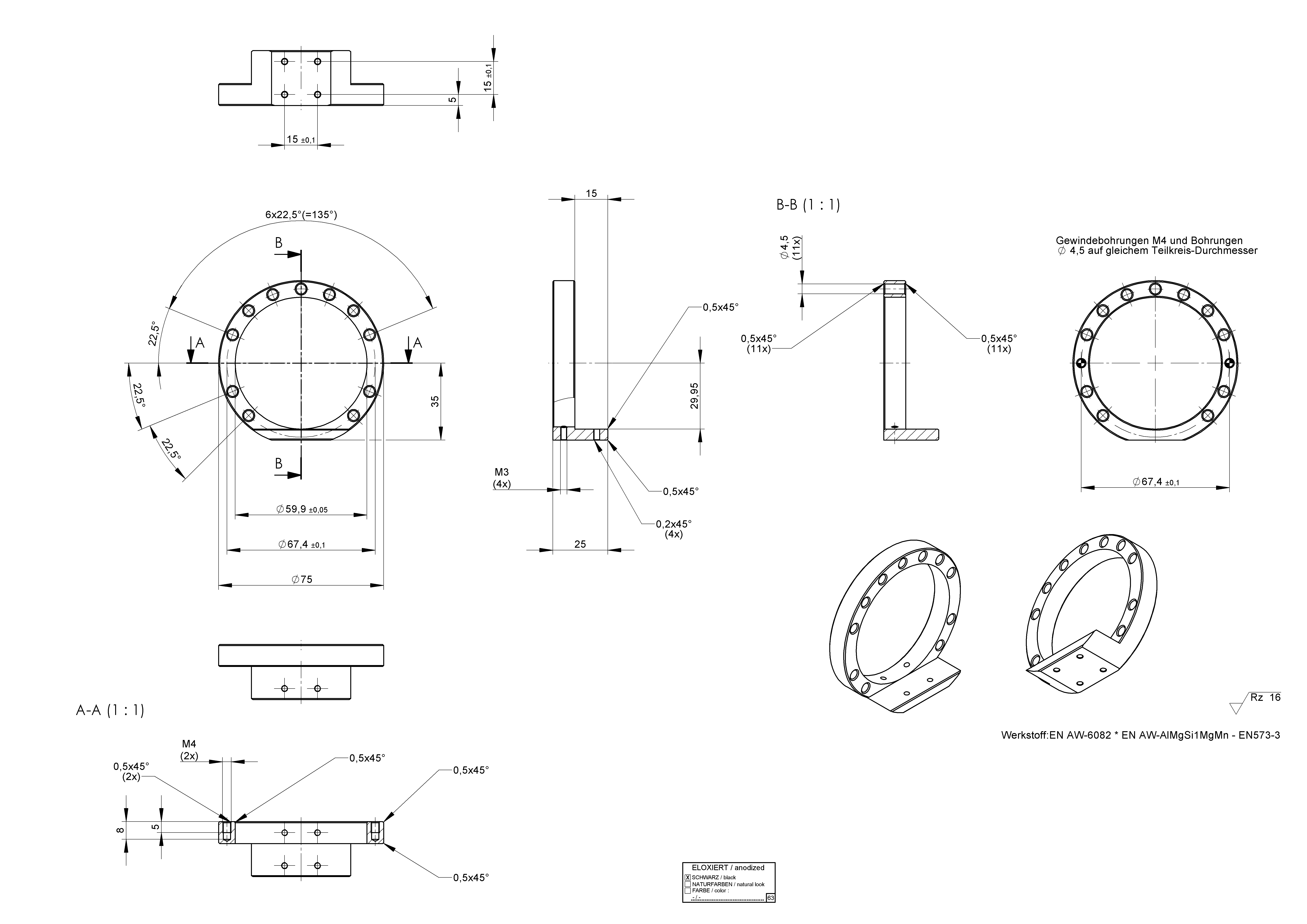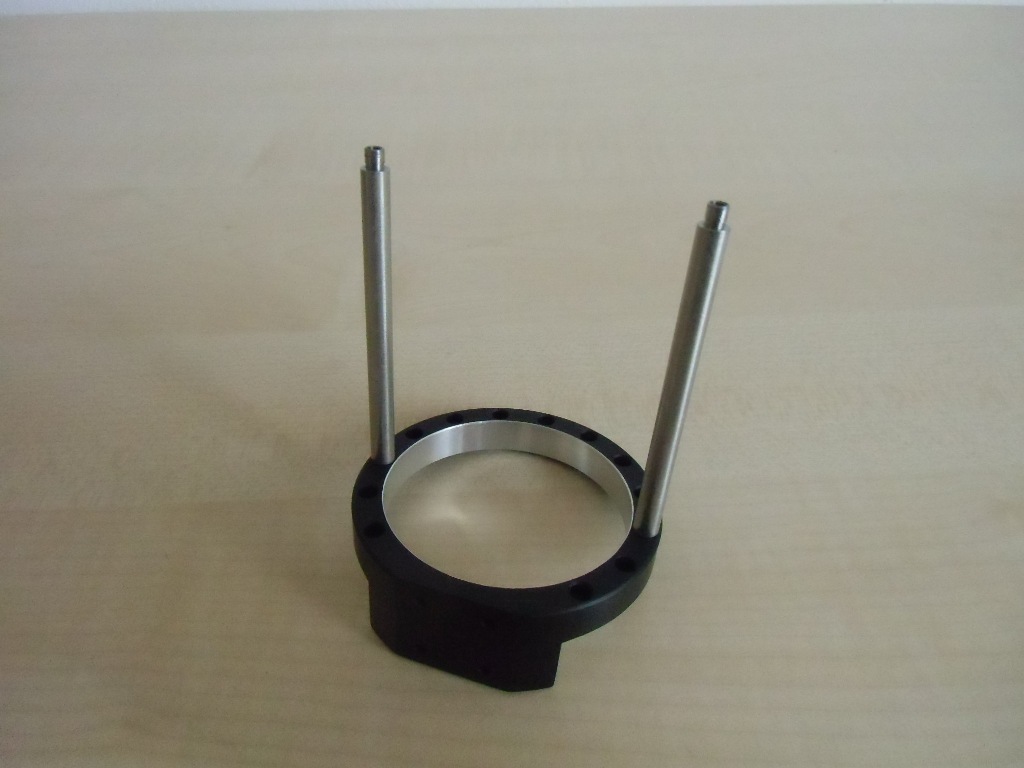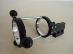 Die präparierten Stellschrauben werden eingeschraubt und die Aufnahme für die Digitalkamera wird mit den vier Senkschrauben befestigt. Am Prototypen mussten die Aluringe etwas nachgearbeitet werden, das kann man an der fehlenden Eloxalschicht deutlich erkennen. Die hochgeladenen Konstruktionszeichnungen weisen aber schon die korrigierten Maße auf.