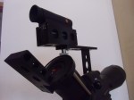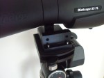 Das Spektiv kann jetzt durch Schnellwechselplatte und Basisplatte hindurch mit der modifizierten Stativschraube verschraubt werden, anschließend wird das Ganze auf dem Getrieberegler befestigt. Die Strebe 1 wird dann auf die Basisplatte gesteckt und mit den beiden Linsenkopfschrauben M5x16-A2 fixiert.