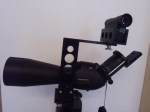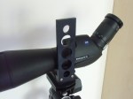 Die Installation ist dabei denkbar einfach und bemerkenswert stabil: Der Digiscope-Adapter kann leicht auf das Okular des Spektivs aufgeschoben werden und wird am hinteren Teil desselben mit drei Kugeldruckschrauben ausgerichtet und geklemmt. Die das Spektiv berührenden Teile der Schrauben sind dabei übrigens aus Kunststoff. Die Augenmuschel des Okulars besteht aus einem leicht konischen Gummiring durch den eine Klemmung herbeigeführt werden kann: Der erste Aluring mit größerem Durchmesser wird einfach darüber geschoben, der zweite hingegen ist untermaßig und klemmt beim Aufschieben. Sollte der Adapter nicht ideal koaxial zum Okulartubus liegen, kann nun an den Kugeldruckschrauben vorsichtig nachjustiert werden. Kameraspezifisch ist nur das Bauteil „Aufnahme“, hier finden sich zwei Bohrungen mit Durchmesser 12mm, durch die später eine ¼“-Stativschraube zur Klemmung der Kamera durchgeführt wird. Die Positionen der Bohrungen sind auf die Position des Kamera-Stativgewindes und der Objektivlänge bei minimalem und maximalem Zoom abgestimmt. Die übergroßen Durchmesser von 12mm ermöglichen es später, die Kameralinse korrekt am Okular des Spektivs noch horizontal auszurichten, wenn der Bildausschnitt nicht mittig liegen sollte.