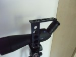 Bei der Konstruktion der Montage standen bei mir zwei Dinge im Fokus: Erstens musste ich eine geeignete Klemmvorrichtung für den LRF entwickeln, da dieser wie bereits erwähnt kein Stativgewinde besitzt und zweitens wollte ich ihn an einer Stelle positionieren, an der der Spotter mit möglichst wenig eigener Bewegung schnellstmöglich Ziele erfassen kann. Hier hat sich der Kauf eines Spektivs mit Schrägeinblick gerächt, aber eines mit Geradeinblick habe ich schlichtweg nicht zu solch einem günstigen Preis bekommen. Problematisch war es deshalb, weil das Spektiv in seiner Gesamthöhe durch das schräge Okular höher baut, als eines mit Geradeinblick. Da man sowohl einäugig durch das Spektiv, als auch durch den LRF blickt, liegt es nahe, beide Okulare möglichst eng beieinander zu positionieren. Durch eine Drehung des LRF um seine Okularachse würde man ggf. sogar noch etwas Platz gewinnen, das hätte aber zur Folge, dass sich alle Anzeigen auf dem Display des LRF mit gedreht hätten – dumm gelaufen. Nach vielen Versuchen mit Alustreben, Klebeband und Verdrehungen des Spektivs in seinem Klemmring, habe ich mich dann dazu entschlossen, das Spektiv nicht zu verdrehen und von schräg oben hinein zu schauen. Sobald man dann aber den Kopf wieder aufrichtet, sollte das Okular des LRF vor dem Auge sein. Um weder bei der Entfernungsmessung, noch beim Spotten mit den Geräten zu kollidieren (Stirn, bzw. Kinn), habe ich für den LRF eine Schwenkmontage konstruiert, die über eine Rändelschraube arretiert werden kann. Ich wollte die Arretierung zunächst bequem durch kleine Neodym-Magnete erreichen, hatte dann aber doch Bedenken wegen der möglichen Auswirkungen auf die Elektronik. Da die Schnellwechselplatte des Manfrotto-Getriebereglers noch Platz für einen zusätzlichen Schraubenkopf hatte, habe ich die Basis der LRF-Montage so ausgeführt, dass das Spektiv demontiert werden kann, wenn der LRF allein benutzt werden soll. Aber auch der LRF ist mit seiner Halterung sehr schnell von seiner Basisplatte demontierbar, dafür sind lediglich zwei Schrauben zu lösen. Durch die beiden Zylinderstifte in der Basis besteht bei der Demontage auch nicht die Gefahr, dass der Entfernungsmesser herunter fällt, da die Halterung weiterhin stabil aufgesteckt bleibt.