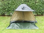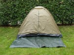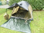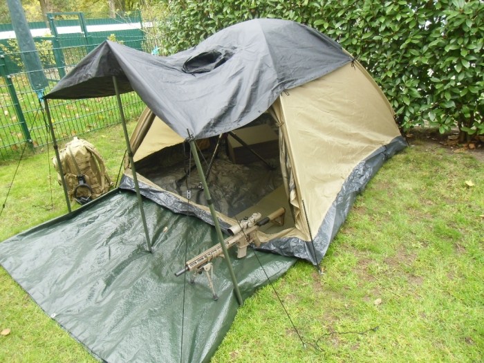 Beginnen wir mit dem Zelt: Der Markt an Zelten ist gross, da kann man schon einige Zeit mit der Suche nach dem geeigneten verbringen. Meine Kriterien waren folgende: Genügend Platz für Schütze und Spotter inklusive deren Ausrüstung, kleines Packmass und günstiger Preis. Vor allem letzteres, denn das Zelt sollte eine Notlösung sein, ich will ja nicht zum Dauercamper auf dem Event werden (obwohl… eigentlich doch!). Dass ich für günstiges Geld damit rechnen muss, Abstriche zu machen, war von Vornherein klar, es sollte ja auch nur Regen abhalten – im schlimmsten Fall Dauerregen von ca. 6 Stunden. Da das klassische Scharfschützenteam nun mal aus zwei Mann besteht, habe ich ein Iglu Dreimann-Zelt bei ASMC gekauft, schließlich soll man sich in dem Zelt auch noch bewegen können. Das Packmass ist mit ca. 60cm x Durchm. 20cm und 2,4 kg Gewicht nicht übertrieben gross und der Preis hält sich mit knapp 35 Euro stark in Grenzen.