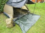 Probeliegen im Zelt hat dann ergeben, dass der Schütze durchaus doch noch nass werden kann, weil vor dem Zelt eben kein Regenschutz vorhanden ist – Ihr könnt das beim Kauf Eures Zeltes ja besser machen als ich. Aus einer früheren Bestellung bei ASMC habe ich aber glücklicherweise noch zwei Poncho-Liner, die man aufknöpfen und als Tarp / Zeltplane benutzen kann. Da sie rundherum nicht nur mit Ösen, sondern auch mit Kordeln versehen sind, habe ich einen davon als zusätzlichen Regenschutz kurzerhand über das Zelt geworfen und mit den dortigen Stangenschlaufen verknotet. Vorne ist er noch mit drei Teleskop-Zeltstangen und etwas Schnur abgespannt. Den zweiten Poncho werde ich bei Regen dann seitlich des ersten anknüpfen und bis auf den Boden abspannen, so ist der Schütze dann auch seitlich vor Regen geschützt.