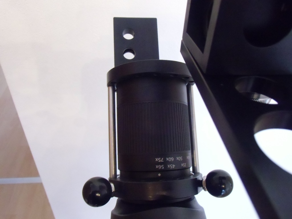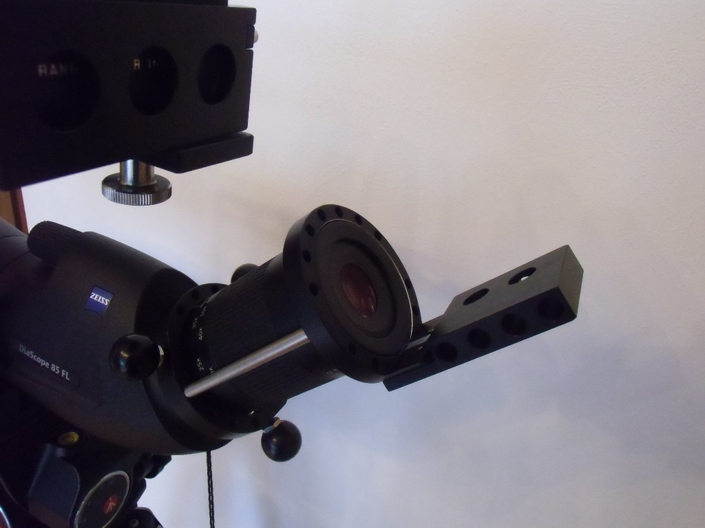 Größten Wert wurde bei der Konstruktion darauf gelegt, dass die Vergrößerung des Okulars weiterhin verstellbar bleibt und zudem noch komfortabel bedient werden kann. Auf dem nächsten Bild kann man deutlich den Spalt zwischen Okular und Verbindungsbolzen erkennen.